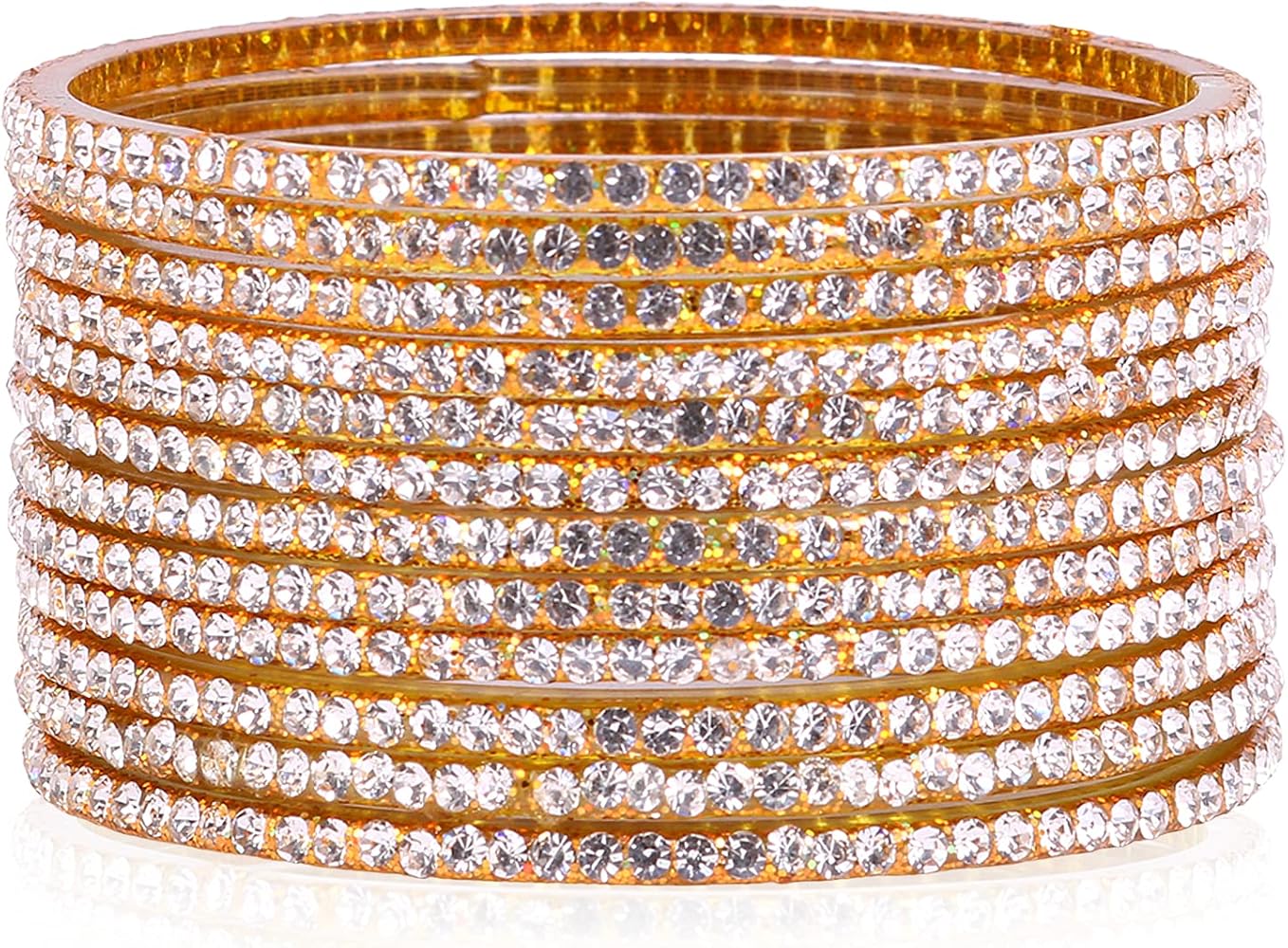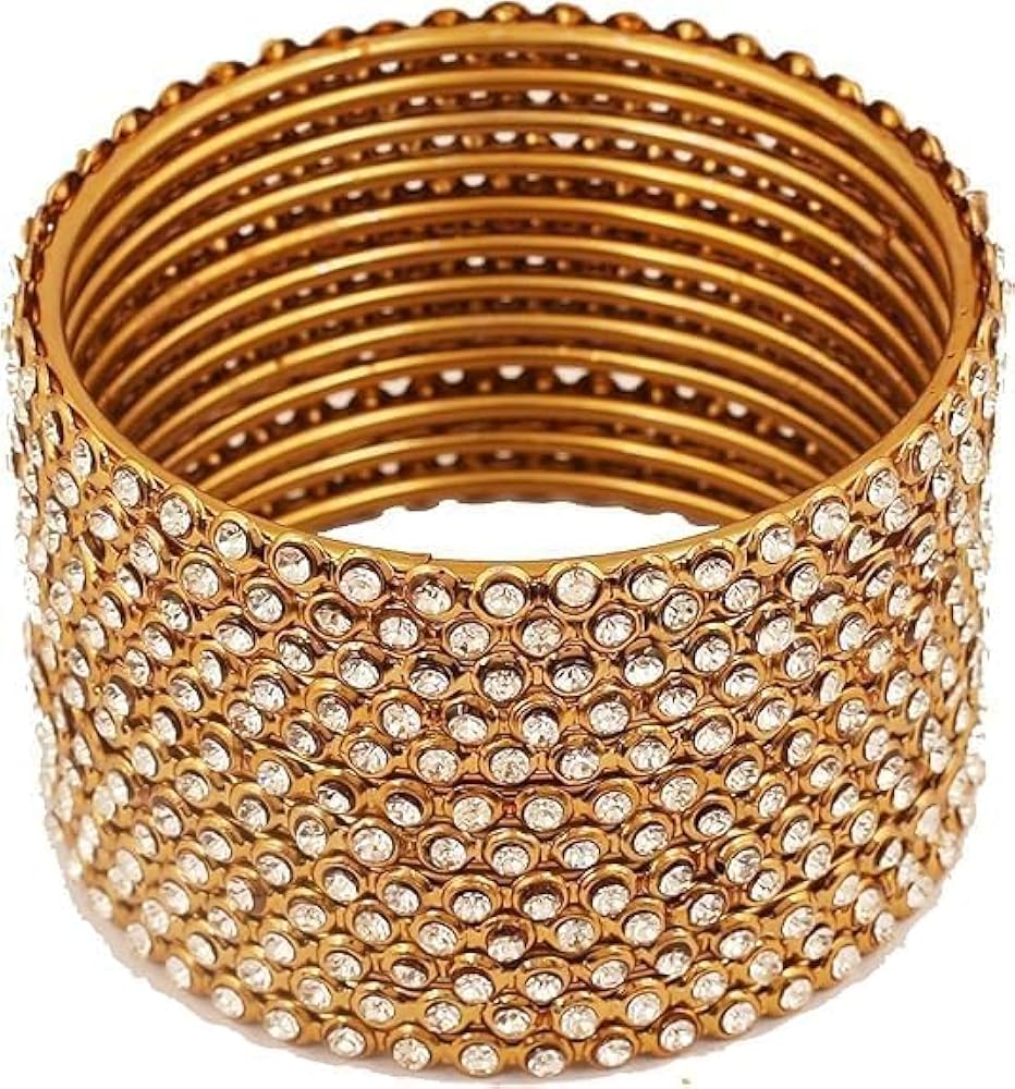 Stunning Indian Golden 4 Pair Set featuring brilliant rhinestones and crystal embellishments on rich golden base! A luxurious stack design with full sparkle coverage, creating an elegant and eye-catching look. Perfect for weddings, parties, festivals, and special occasions. Beautiful set combining traditional charm with modern glamour adds golden shine to your style today!