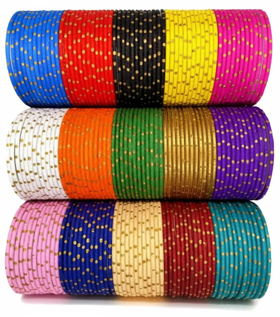 Vibrant Metal Bangles 12 Pics Set featuring colorful dotted detailing with golden accents on smooth metallic finish! Complete set in 12 stunning colors including blue, red, yellow, pink, green, orange, purple, and more. Perfect for weddings, festivals, parties, and daily wear. Mix and match with any outfit for a playful, festive look—grab your favorite colors today!
