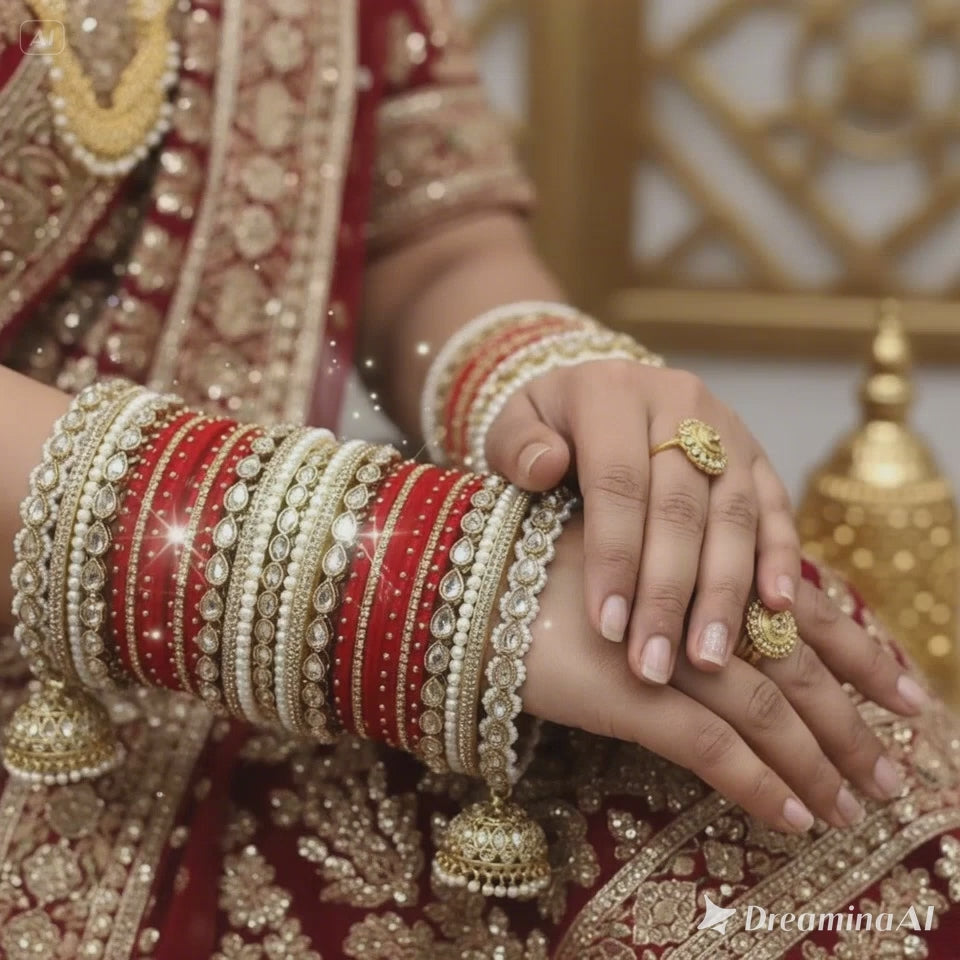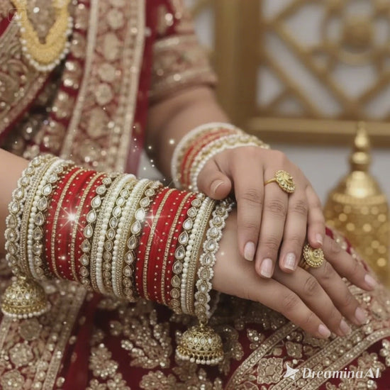 Magnificent Red Metal Bridal Barat Set featuring exquisite polki stones, lustrous pearls, and gorgeous jhumka hangings! Complete wedding stack with intricate craftsmanship, perfect for barat and special occasions. Available in sizes 2.6 and 2.8 for a comfortable fit your dream bridal set is here!